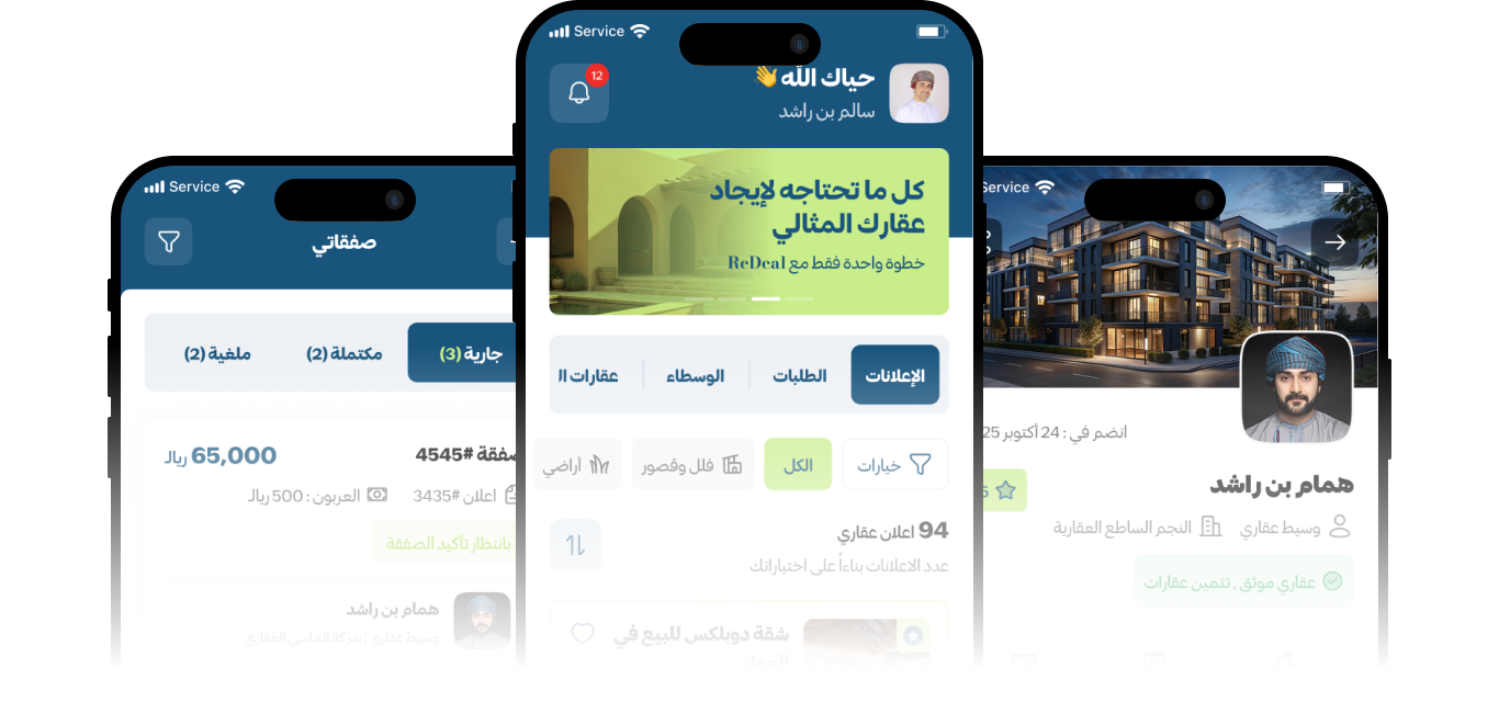 ReDeal هو تطبيق عقاري متكامل في سلطنة عمان يتيح للمستخدمين البحث عن العقارات وإتمام الصفقات العقارية بطريقة آمنة وموثوقة، مع توفير تواصل مباشر بين المستخدمين، الوسطاء العقاريين، والمطورين العقاريين.